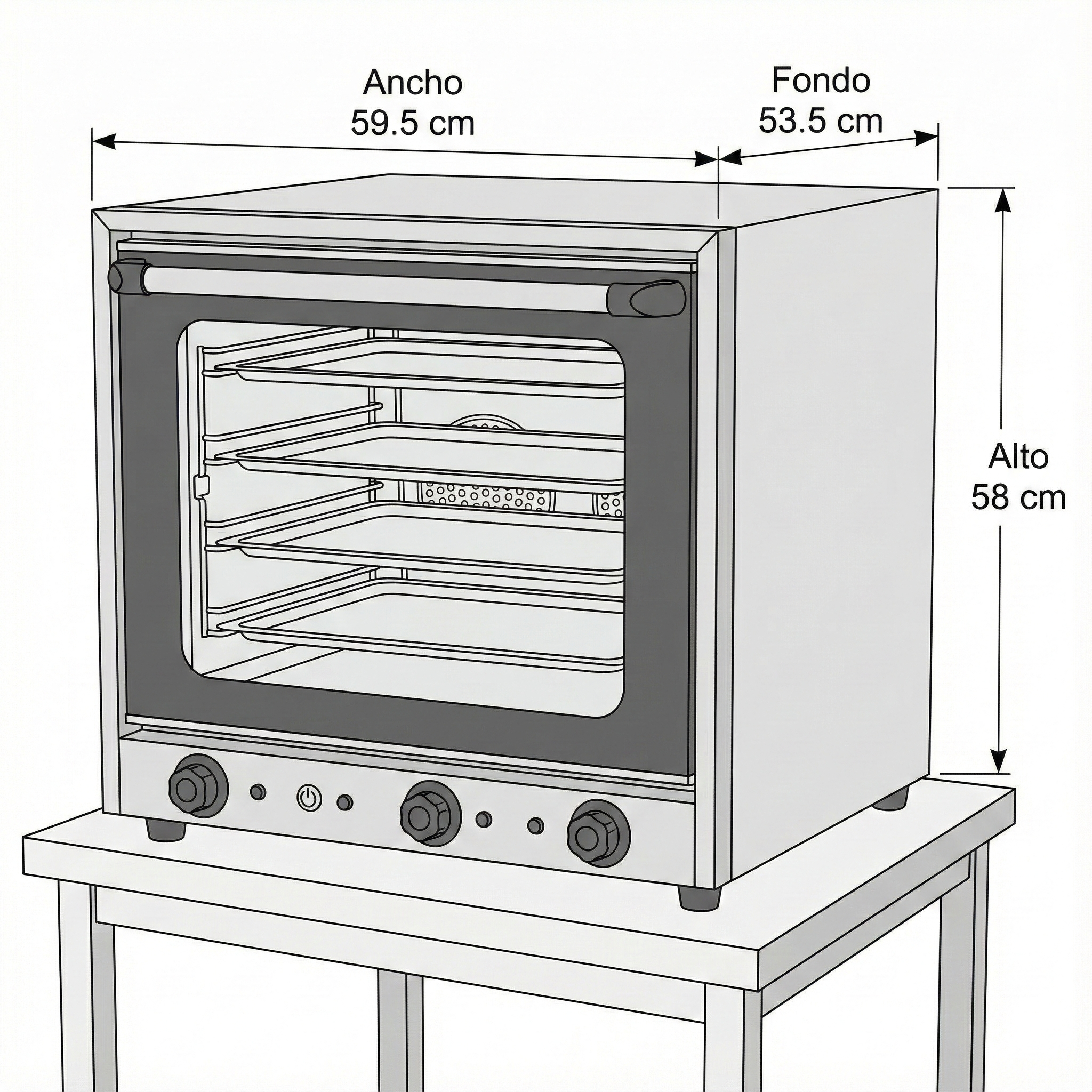 Capacidad y Espacio: Las dimensiones de las cabinas (alto de 17 cm, ancho de 64 cm, fondo de 54 cm) permiten una cocción eficiente de diferentes tipos de alimentos. En total, el horno puede acomodar tres bandejas, optimizando el espacio para una producción diversificada.