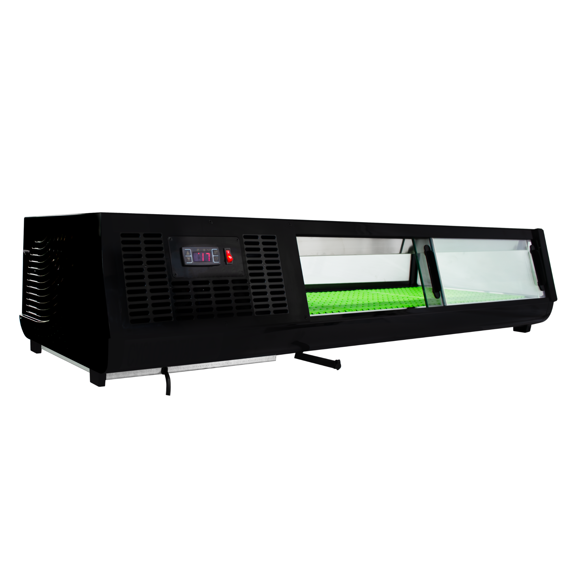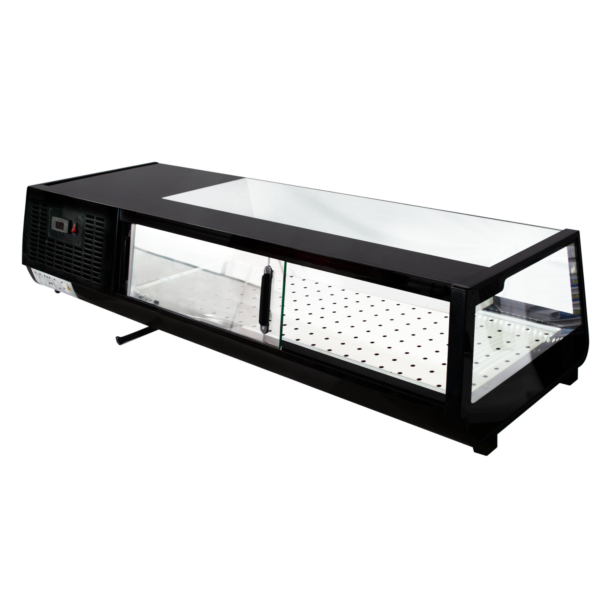 Vitrina refrigerada para sushi con temperatura de 2°C a 12°C, iluminación LED y diseño compacto. Ideal para exhibir y conservar productos frescos con alta rotación.